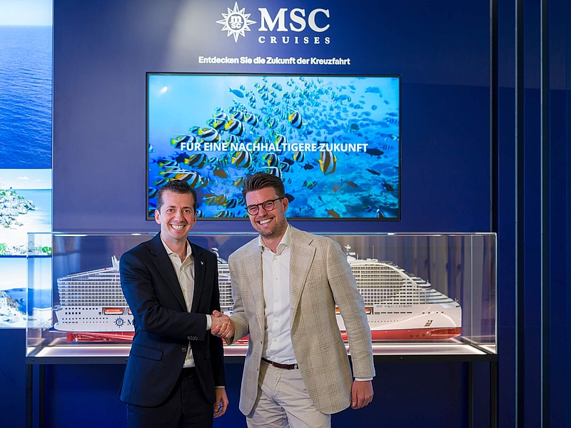 Bildunterschrift: Georg Schmickler, Chief Business Development Officer bei MSC Cruises, (l.) und BTW-Generalsekretär Sven Liebert am heutigen Mittwoch in Hamburg | © Frank Erpinar